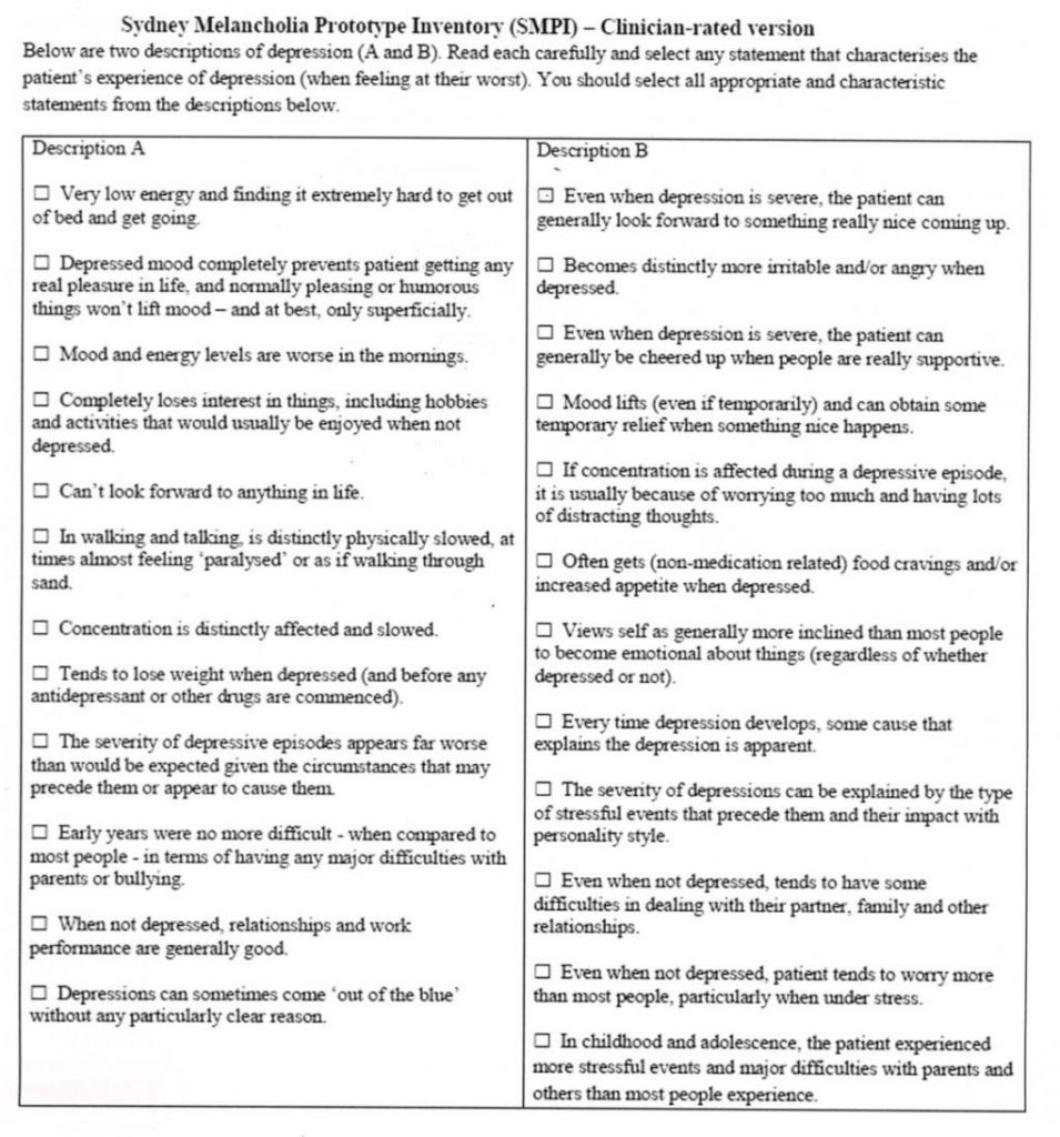 (at the risk over overstepping the doctor-consumer boundary) this questionnaire (reproduced for study purposes only from a Dr Parker3. paper), with its take-home message that if one’s scores for each column differ by four or more points, a diagnosis (melancholia vs non-melancholic depression) may be statistically valid: