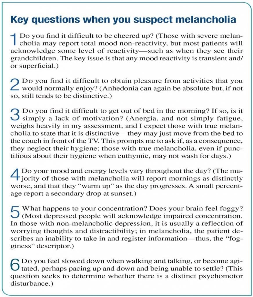 and, the good Professor’s “6 key questions when you suspect melancholia” (again, for study purposes only)…