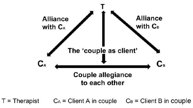 As pictured, the therapeutic triad involves the relationship between each partner and the therapist (between-system) and the relationship between the partners (within-system), with research(17.) having identified the four dimensions of coherence required for successful outcomes: