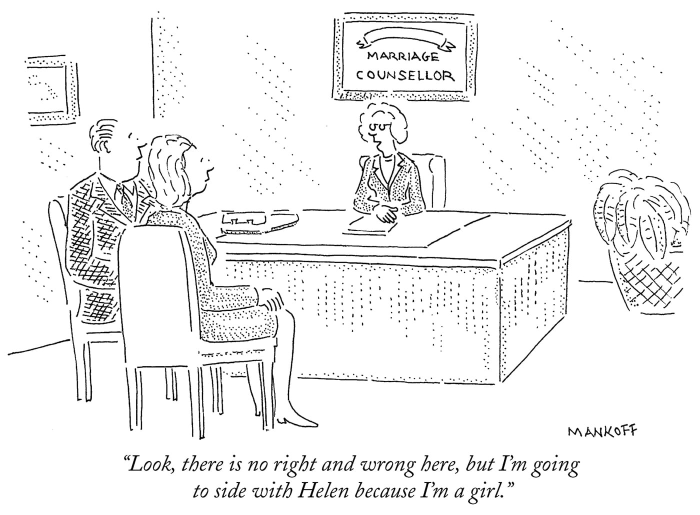 Indeed, a main complaint reported by men in couples therapy is that the therapist routinely takes the side of the female partner through subtle, often non-verbal signs of approval that support her bids for increased communication and connection while regarding his more problem-solving approach as dysfunctional.