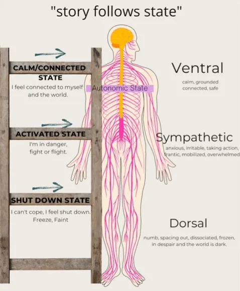 In a nutshell, after reiterating that our early experiences primarily shape our ANS, PT asserts that on-going internal and inter-personal experiences move us through a continual cycle of mobilisation, disconnection, and social engagement (corresponding to sympathetic, DVC, and VVC ‘states’ respectively) as we respond to our changing environment(3.).
